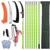 【Pole Saws for Tree Trimming】This tree pruner pole saw is designed for easy tree trimming. With its strong toughness and sharpness, it can effortlessly cut through branches. Suitable for palm trees, pine, fir and oak and more. This manual pole saw is widely used in lawns, gardens, forestry and other places where trees need to be trimmed. You can also easily trim high and hard-to-reach branches without bending down, climbing a ladder, and avoiding the dangers of working at heights. 【Spring-Action Pruning Jaws and Hacksaw Head】 Ideal for shearing smaller branches, the pulley-operated spring-action pruning jaws are made of hardened carbon steel. The high-strength alloy hacksaw head, after high-temperature heat treatment, features sharper grinding teeth on three sides for smoother cutting, making it very suitable for sawing thicker branches. 【Extendable Pole Saw】 The tree pole saw has 8 poles of 3.28 feet each, with a maximum length of 27ft, this extendable tree trimmer allows you to reach higher branches without the need for a ladder. It provides convenience and safety during tree trimming.