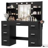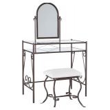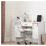 - The desk offers ample storage with two open cubbies, a spacious drawer on metal slides, and two cabinets with adjustable shelves. It also includes four coordinating storage baskets to keep cosmetics and accessories neatly organized.