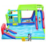 - 【Multiple Entertainment Areas】-RETRO JUMP inflatable 9 in 1 Flamingo water slide features a climbing wall, curved slides,large wading pool,toy market stand,bounce area,basketball rim,water cannon,overhead sprinkler. It will bring much happiness to your children and they can share precious playing time with their friends!