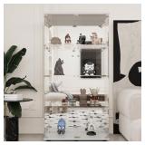 LFT HUIMEI2Y Glass Display Cabinet 4-Shelf with Double Door, Lock, and Mirror, Curio Cabinets Upgraded Quick-Install Style Tempered Glass Showcase for Bedroom, Living Room, White