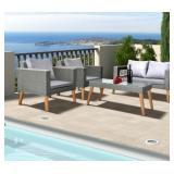 Discover the epitome of outdoor elegance with our 4 Piece Outdoor Patio Furniture Set, a harmonious blend of sophisticated design and natural beauty. Crafted with the finest resin rattan and accented with exquisite acacia wood, this set stands as a testament to both style and sustainability, creating the perfect setting for entertaining or relaxing in your backyard, balcony, or deck. With spacious seating, soft thick cushions, and a durable design, this set is ideal for gatherings with family and friends or enjoying some peaceful time outdoors.
