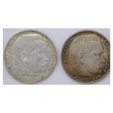 - 1934 and 1935 German 5 Reichsmark Paul von Hindenburg Silver Coins