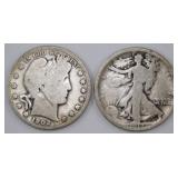 - 1902 Barber Half Dollar and 1917 Walking Liberty Half Dollar Silver Coins