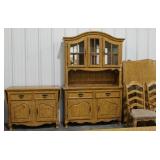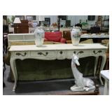 1310 Real nice French provincial design foyer / sofa table with, five drawers with vine leaf decor pulls and carvings, home decor piece here worthy of your attention, with the small center drawer having lock and key which works, 78w x 17d x 34 high, don't mis