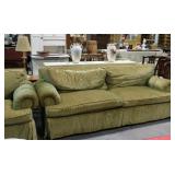 1290 Upholstered living room sofa green and gold tone fabric, cushion seating, does have some wear and tear on skirt fabric