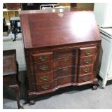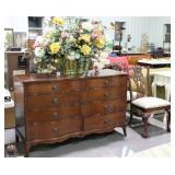 1313 Mahogany Serpentine front 8 drawer dresser with early brass drop pull the top board does show some use scratch in the Finish, should easily polish out otherwise and real nice condition measures 60 inches wide 22 deep by 38 inches high, includes