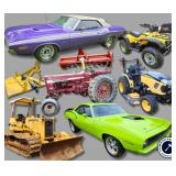 HIGHLIGHTS: 1971 Dodge Challenger Convertible; 1970 Plymouth Hemi 'Cuda; Yanmar SX3100 Tractor with mower; Komatso D31P Crawler/Dozer; Case 580K Backhoe; 756 Gas Tractor (presently not running); 3 Point Equipment; Hand & Power Tools; Shop accessories; 150+ lots to be sold to the highest bidder.