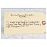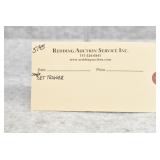 Redding Auction Service Inc. reserves the right to hold any or all merchandise purchased by personal check until the check has cleared the bank. If shipping is requested/required by the purchaser, all packing and UPS/USPS shipping charges will be paid prior to shipping. Forms of Payment Accepted for Purchases: CASH or PENNSYLVANIA CHECKS OUT OF STATE CHECKS WITH PRIOR APPROVAL MC/VISA/DISCOVER/AMEX ACCEPTED (A 4% ADMINISTRATIVE FEE WILL BE CHARGED) YOUR BIDDING ACCEDES YOUR ACCEPTANCE OF THESE CONDITIONS OF SALE.