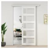 (120) BARNSMITH 42in x 84in Glass Barn Door with 7FT Brushed Nickle Sliding Door Hardware Kit Included & Handle,5-Panel Frosted Glass Solid Wood Water-Proof PVC Surface,Pre-Drilled Easy Assembly,White