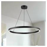 This LED pendant light from Hampton Bay is a modern indoor light fixture, designed to suit a variety of home decor styles from transitional to contemporary. The decorative hanging ceiling light will work well as a kitchen light fixture, dining room light, foyer light and more. The fixture is constructed of black finished metal and includes a circular design that hangs from a matching canopy. The hanging wires allow for an adjustable height and the ability to install on a sloped ceiling. The integrated LED design is low maintenance as you will never need to change light bulbs for the life of the fixture. This pendant light looks beautiful with the lights on or off, and will make a bold statement in any home.