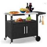ROVSUN Gourmet Grill Cart revolutionizes outdoor cooking with its all-in-one functionality! This heavy-duty grill cart features a stainless steel top and spacious storage cabinet for keeping utensils, spices, and ingredients organized. The utility table includes handy hooks and a spice rack, while foldable extensions provide extra workspace for pizza oven nights or tailgating parties. Built with durable, easy-clean materials, its waterproof and heat-resistant surfaces withstand rigorous outdoor cooking. Four lockable wheels (two large for rough terrain) ensure smooth mobility from backyard to camping site..
