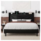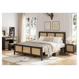 Qeetex Bed frame with headboard black boho cane platform bed frame with strong metal slat noise free no box spring needed