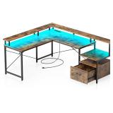Rolanstar Computer Desk with File Drawer, 64" L Shaped Desk with Power Outlet & LED Strip, L Shaped Corner Desk with File Cabinet, Home Office Desk with Monitor Shelf, Rustic Brown