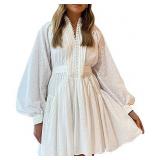 Roiii Women A-Line Lace Loose Baroque Button Down Long Sleeve Casual Dresses V Neck Embroidery Party Short Dress XL