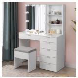 UBesGoo Vanity Desk with Sliding Mirror & Lights Makeup Vanity Table with 6 Drawers, Storage Shelves, Cushioned Stool, White Dressing Table with Adjustable Light for Women