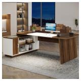 ****BOX 1/2 ONLY**** Tribesigns L-Shaped Executive Office Desk, 70.5-Inch Mid-Century Modern Executive Desk with Storage Cabinet and Shelves, Large Computer Desk for Home Office, Brown + White