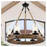 LNC Farmhouse Chandelier 6-Light Black Wagon Wheel Wood Island Chandelier with Clear Seeded Glass Shade and Rope Accents