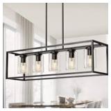 5-Light Dimmable Matte Black Linear Rectangle Chandelier Kitchen Island Pendant Light with Clear Glass Shade