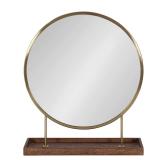 Create a centerpiece that makes a bold impression with the gorgeous table mirror. The tabletop mirror takes inspiration from midcentury modern design to create a beautiful accent piece for your home. It features a trendy, circular mirror elevated by a sleek metal frame attached to a solid wood base. It is handcrafted in India by skilled artisans, making each piece in the collection distinct in woodgrain and finish. The two-tone black and refined natural wood finish capture a chic, midcentury aesthetic that draws the eye and brings your decor together. The mirror makes a staggering statement on a vanity, console table, dresser, or dining room table. The wood base adds an extra dimension of functionality to the mirror, providing a surface to quickly stash jewelry, makeup powder, keys, and more.