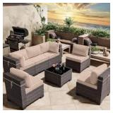 (44). Halmuz 7-Piece Wicker Outdoor Sectional Set with Cushion Sand