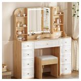 YYJ 42" Makeup Vanity Desk with Mirror and Lights, & Power Outl,Glass Top Big Vanity Table with 9 Drawers& 8 Storage Shelves,Dressing Table Set with Chair for Bedroom, Oak and White