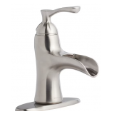 The Allen + Roth single handle faucet from the Sumter collection features a brushed nickel finish and a matching push pop-up drain. This faucet is detailed with simple curves and a waterfall style that allows water to smoothly cascade from the faucet.