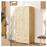 VINGLI Wardrobe Closet with Doors, Rattan Armoire Wardrobe Closet with Drawers & Hanging Rod, Wooden Armoire for Hanging Clothes, Natural Oak, 68.9" H