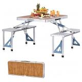 Folding Picnic Table with Seats Chairs and Umbrella Hole, Portable 4-Person Fold Up Travel Picnic Table for Indoor Outdoor Travel, Camping,BBQ,Party,Bamboo+ Aluminum Alloy (Silver)