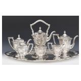 Silver is one of the most extensive portions of the auction, anchored by the Dominick & Haff / Gorham sterling silver tea service. Other significant offerings include Wallace “Campania” sterling flatware, Welsch 900 silver chargers, a Bailey Banks & Biddle sterling tray, a Georg Jensen sterling bar set, a Georgian sterling epergne, Gorham sterling vases, a Jean Lucien Ferry silver and glass caster set, and a Graff Washbourne & Dunn sterling service. Additional entries include Gorham / Lenox sterling and porcelain pieces, a Georgian British dish cross, and several flatware and service assortments spanning American and European makers.