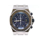 The watch section features a substantial group of Swiss and international wristwatches across multiple makers and case styles. Rolex is represented by a 14k yellow gold ladies’ Rolex, a Rolex Oyster Athlete, and two Rolex Oyster Perpetual models in stainless steel and classic Oyster configurations. A major highlight is the Audemars Piguet Royal Oak Offshore Chronograph, an example of the brand’s well-known integrated sports watch design. Breitling appears prominently with a broad selection that includes the Breitling Emergency, Emergency Mission, Breitling B-1, Chronomat, Aerospace, Jupiter Pilot, Old Navitimer, the Breitling for Bentley Motors, and the “Top Gun” Navitimer. Additional offerings include the Cartier Santos Galbée and two Eska 18k gold automatic wristwatches with cloisonné dials.