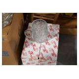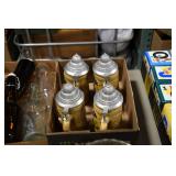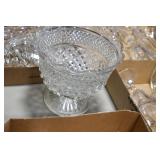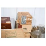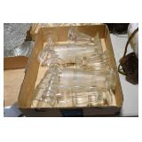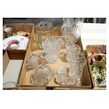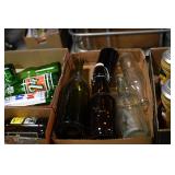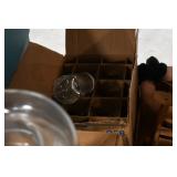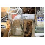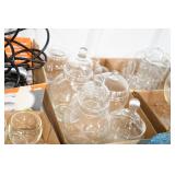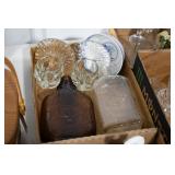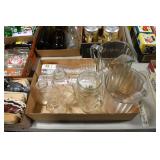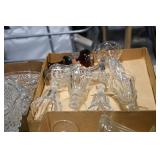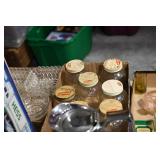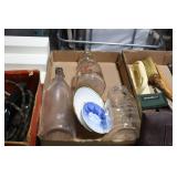 Antique Glassware: 17 Lladro Figures w/Boxes, Large Amount of Vintage Glass Bottles and Jars, Milk Bottles, Colored Vases, Glass Ash Trays, Collectible Glass Mugs, Nagoya Tea Set, Carnival Glass, China, Pink Depression, Large Glass Kitchen Canister Set, Glass Figures, Mixing Bowls, Glass Bells, Retro Tea, Coffee, Milk, and Sugar Set, Glass Building Ink Well, Precious Moments Figures, and Other