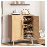 Ktaxon 4 Tiers Shoe Storage Cabinet for Hallway, 2-Door 16 Pairs Rattan Shoe Rack Organizer w/ Adjustable Shelves, Natural