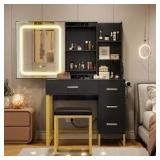 Garvee Black Vanity Desk with Mirror and Lights, Makeup Vanity Desk with Sliding LED Lighted Mirror, Power Outlet, Makeup Vanity Set with 4 Drawers, Storage Shelves, Cushioned Stool for Bedroom