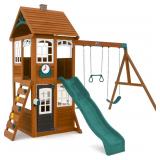 (181) KidKraft Kennedy Springs Wooden Outdoor Swing Set with Slide and Rock Wall