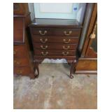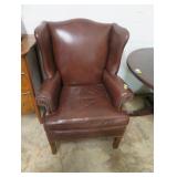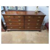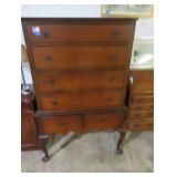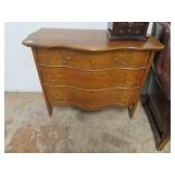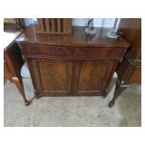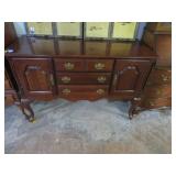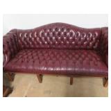 Biggs 10 drawer dresser; Drop front small desk with painted scene; Blanket box on Queen Anne legs; Small buffet with shell carving; Burgundy tufted executive leather sofa; Nice sideboard; Silver chest; Serpentine front secretary with bookcase top; Leather armchair; Chest with Oriental carvings; 4 poster beds; Drop side end table pair; Decorated tea cart; Early 3 drawer dresser; Bar stools; Needlepoint footstool; Side chair; Cane seat rocking chair; Hanging cabinet; Cane seat side chair;