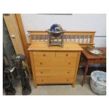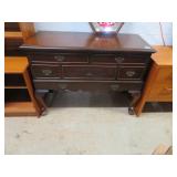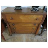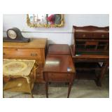 Early Empire style 4 drawer dresser with wood knobs; Beautiful buffet with nice veneer detailing; Painted blue bookcase/cabinet combo; Highboy; Drop front secretary; Golden oak serpentine front washstand; Victorian marble top side tables; Parlor set with love seat & chair; Contemporary Mission style bed & dresser; Another nice desk; Round dining table; White wicker sofa table; Shaving stand; Leather top table with drawer; Painted blanket box; Corner chairs; Hoop back chair; More blanket boxes; Small dresser with mirror;