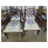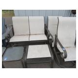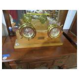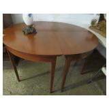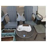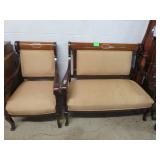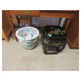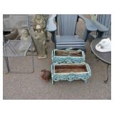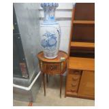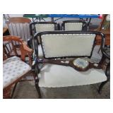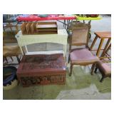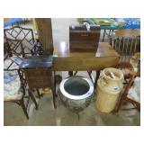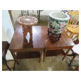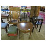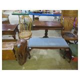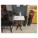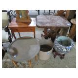 Half round table with decorated top & brass railing; Delicate small oval cabinet with metal escutcheons & brass railing; Large floor planter on stand; Large floor vase; Bamboo look chair set; End table pair; Oval coffee table; Bar seats; Floor candlestand; Small rocker; Marble top 2 drawer stand; Drop side table; Chocolate marble top Victorian table; Tray top table; End table; Nightstand; Love seat with 2 matching chairs; Kitchen clock; Pair of metal birds on tree limbs lamps;