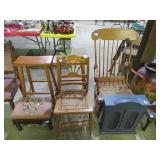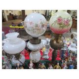 Hanging lights; Crystal table lamp; Pair of chrome & crystal stick lamps; 4 panel table screen; Fishbowl planters; Low seat with Oriental motif paintings; Mantel clock; Ceramic table lamps; Padded bench; Old oak pressed back rolling office chair; Gaming table; Leather footstools; Round table with brass edge; Hitchcock painted rocker; Marble top table with mother of pearl inlay; Room screen; Large Oriental carpets, rugs & runners; Banjo weather station; Fancy wall mirror; Ship’s wheel style clock & weather dials; Several parlor lamps; Lots of Decorator accents & more!
