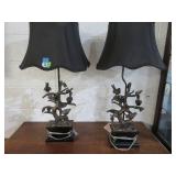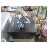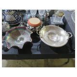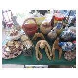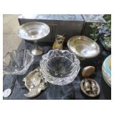 METALS & ART: Sterling & Silver-plate! Compotes; S&P shakers; Tall vase; Serving tray; rimmed coasters; Condiment sets in holders; Beautiful horse portrait; Original streamside scene painting; Oriental crane artwork; Replica carved elephant tusk; City street scene; Kachina; Multiple Ethnic carvings; Painted shield; Elephant carvings; More fine art!