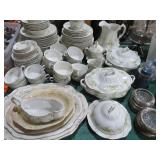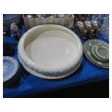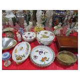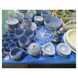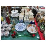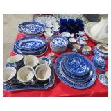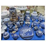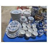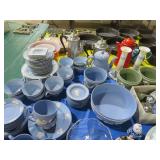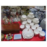 CHINA & GLASS: Lots of Oriental fishbowl planters in multiple colors & sizes; Blue & white floor vase; Native American pottery; Classical statue on Wedgwood base; Blue Onion dinnerware set; Royal Worcester Evesham egg coddlers; Lenox; Lots of blue & white pieces-pitchers, ginger jars, creamer & sugar set, teapots, bell S&P shakers, platters, more; Urn with golden finial; Blue willow serving bowls & more; Table full of figurines; Fine dinnerware sets; Delft canister set;