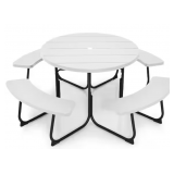 75 in. White Round Picnic Table Outdoor Bench Set Seats 8-People with 4 Benches and Umbrella Hole
