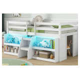 Low Loft Bed with LED Lights, Wooden Twin Loft Bed with Stairs & Safety Guardrail