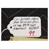 - Civil War Sutlers Check/Voucher for William Bell of the 89th Ohio Regiment Signed by Captain Samual A. Glenn – September 1st, 1863