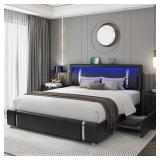 Full Size Bed Frame with RGB LED Lights Headboard & 2 Storage Drawers, Modern Upholstered Faux Leather Smart Platform Bed with Iron Metal Decor, USB & USB-C Charging Ports, No Box Spring Needed, Black