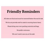 Please follow us on social media to get sneak peaks on our upcoming sales. We honor a watched list. Please line up in order of arrival. We elect the right to open early to help with crowd management. We accept cash and credit cards (credit card is a minimum of $20, and will be charged a 3% fee or $2, whichever is higher). Children are not permitted into the sales for their safety. Restrooms are not available to the public, we apologize for any inconvenience. Please bring help to carry out items. You are welcome to pay for large items and come back with appropriate help during sale hours. Thanks for reading the fine print. We appreciate you! |