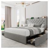 Queen Bed Frame with 4 Storage Drawers, Upholstered Bed Frame with Large Wingback Headboard, Charging Station, No Box Spring Needed, Light Grey