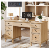 (27) Brafabhome 58" Rattan Executive Desk with 7 Drawers, Modern Study Writing Table Computer Desks with Charging Station for Home Office Bedroom | Beige
