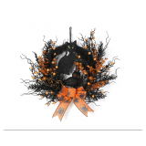 - ăUnique Halloween Designă This Halloween wreath is full of combination of Halloween elements. It is crafted with a black cat, a cute owl, black and orange berries, leaves,branches, and a plaid bow on a black rattan base. Make your front door decoration spooky yet oddly friendly with this creepy Halloween Wreath.