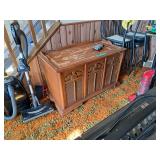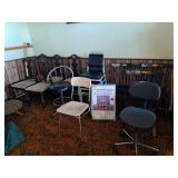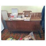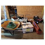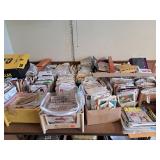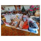 Vintage items: melted popcorn holiday window hangings; floor to ceiling two globe orange blown glass lamp; 100’s of sewing patterns from the 1950’s to current; 100’s of iron on embroidery patterns; beer goblets (Hams, Pabst, Bud); ash trays; RCA stereo console with record player, radio and 8-track player; record albums, cassette tapes and 8-track tapes; some of the furniture and tools are also vintage, plus other items.
