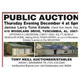 The James L. Tune Estate, 410 Woodland Dr., Tuscumbia Alabama 35674 Carol Ann Nantt, Personal Representative of the Estate of James Larry Tune and Robert G Lee III Colbert County Probate Court Case No. P250133 Tony Neill, Alabama Auctioneer # A5441, Broker Tony Neill Auctioneer/Stables 731-412-2344 OPEN FOR INSPECTION Any time by calling Tony Neill 741-412-2344 anytime ! &Thursday December 4 from 1pm until Auction. Or call 731-412-2344 for a private inspection date and time. UTILITY cost are about $31 per month for water and between $100 and $200 Electric. PIN 50361 PARCEL 14-04-20-0-000-007.008 ACCOUNT 26681 Lot # 9 Woodland Estates Offering; A 3-bedroom, 2 bath, 2520+/- sq. ft. /Manufactory/Mobile/Modular home (MHC-Mobile Home Class C) with some needed repairs, selling as is, as a fixer up. A good deep cleaning, paint, and repairs will make this a home. On a Foundation with private deck overlooking Bluff and back yard. The 2 bay Metal garage has 2 rollup doors, shop door on concrete floor, you can move in and live today and work on it while living there. The 3+acres (a tax map shows 5+acres) are on the mountain with a very private space and living. The Bluff Rock is in your backyard view. Very short drives on Hwy 72 to Tuscumbia, Cherokee, Muscle Shoals and Florence Alabama |